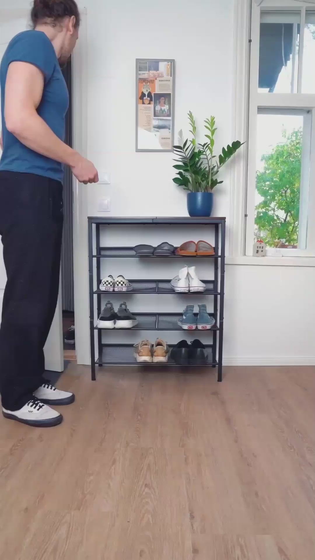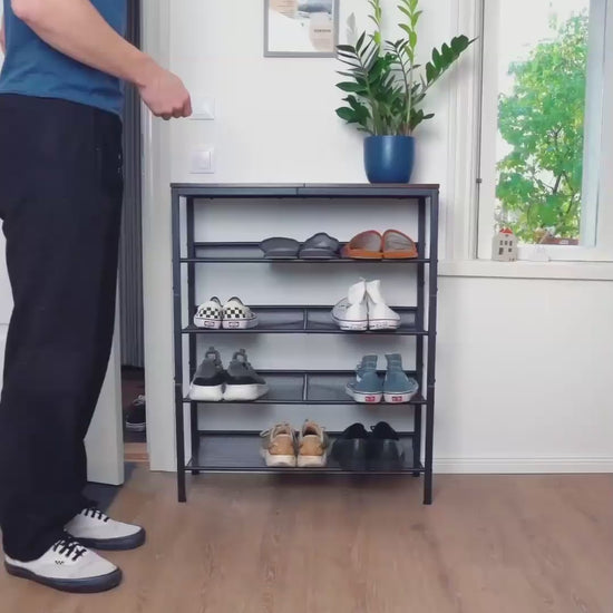 - Rangement flexible : Les 4 étagères métalliques à mailles peuvent être montées à plat ou inclinées et offrent de la place pour 16 à 20 paires de chaussures. L’espace de 20,4 cm entre les niveaux permet également de ranger des chaussures à talons hauts ou des bottes.